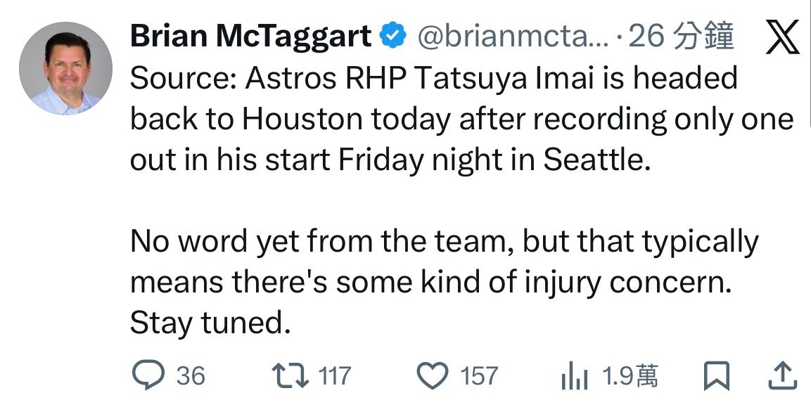 根據太空人記者 Brian McTaggart的推文,今井達也於今日返回休士頓,球隊目前尚未發