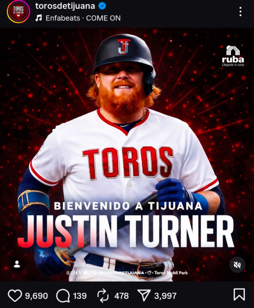 墨西哥聯盟提華納公牛(Toros de Tijuana) 隊剛剛正式官宣Justin Turner加入球隊的