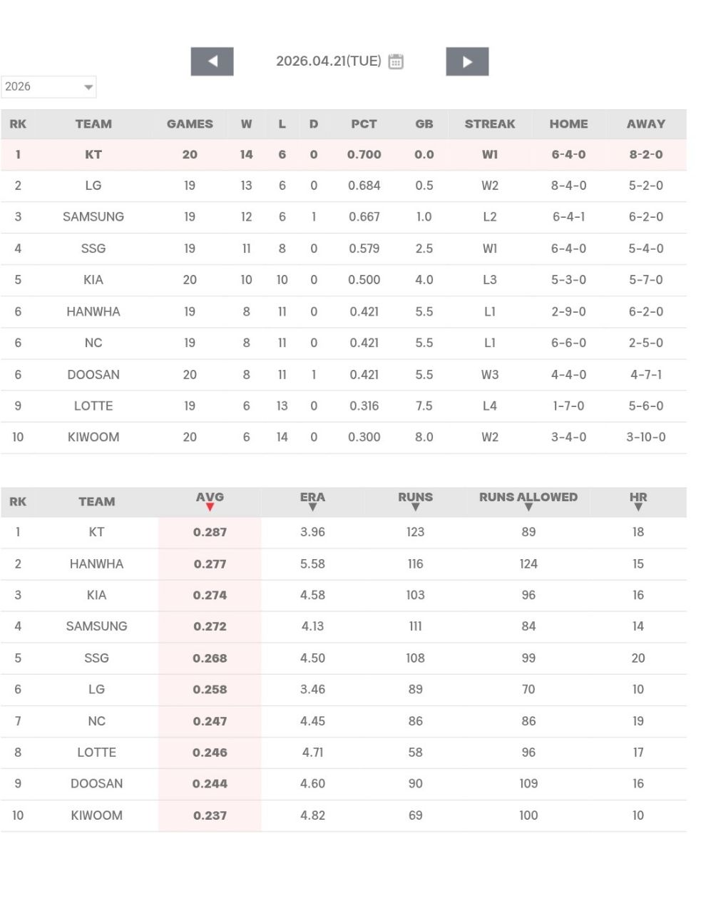 ☆2026戰績(~4/21)(來源:KBO官網)