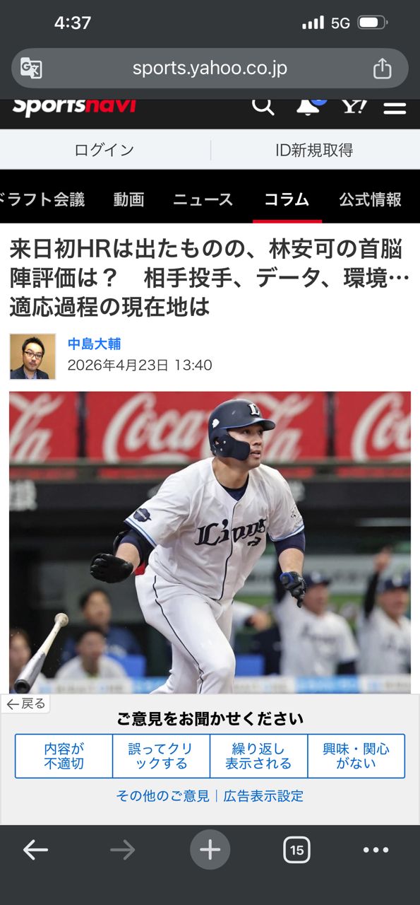 況;西武監督西口文也雖稱讚林安可的再見全壘打,但也提到他的打擊姿勢不差,卻常把
