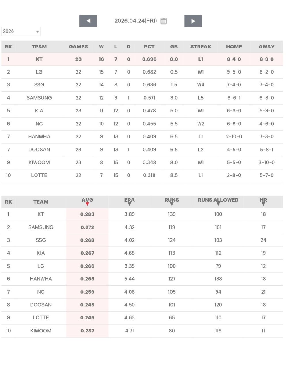 ☆2026戰績(~4/24)(來源:KBO官網)