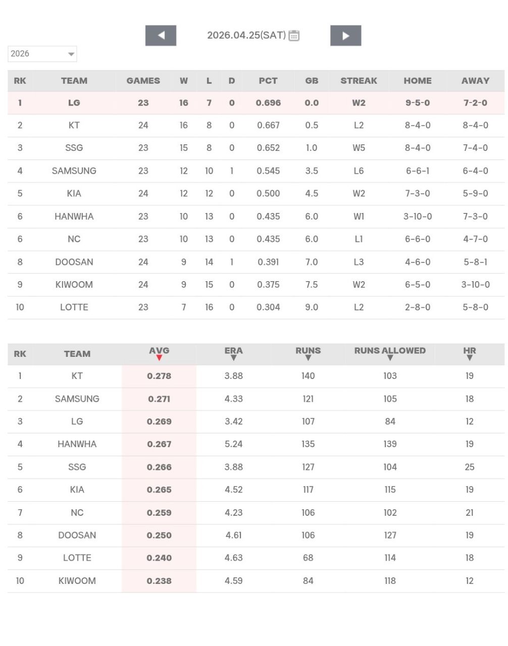 ☆2026戰績(~4/25)(來源:KBO官網)