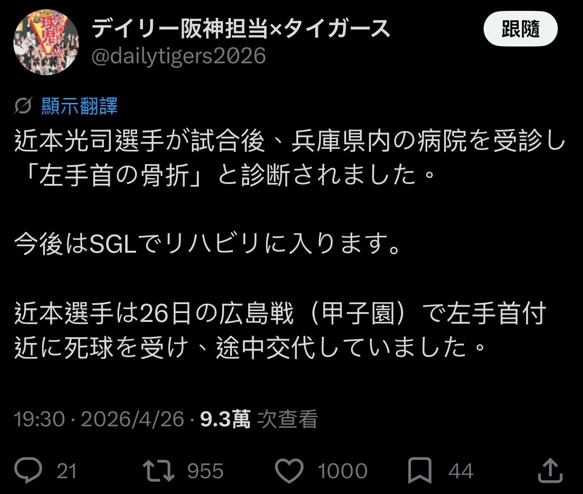 [情報] 阪神虎近本光司 左手腕骨折