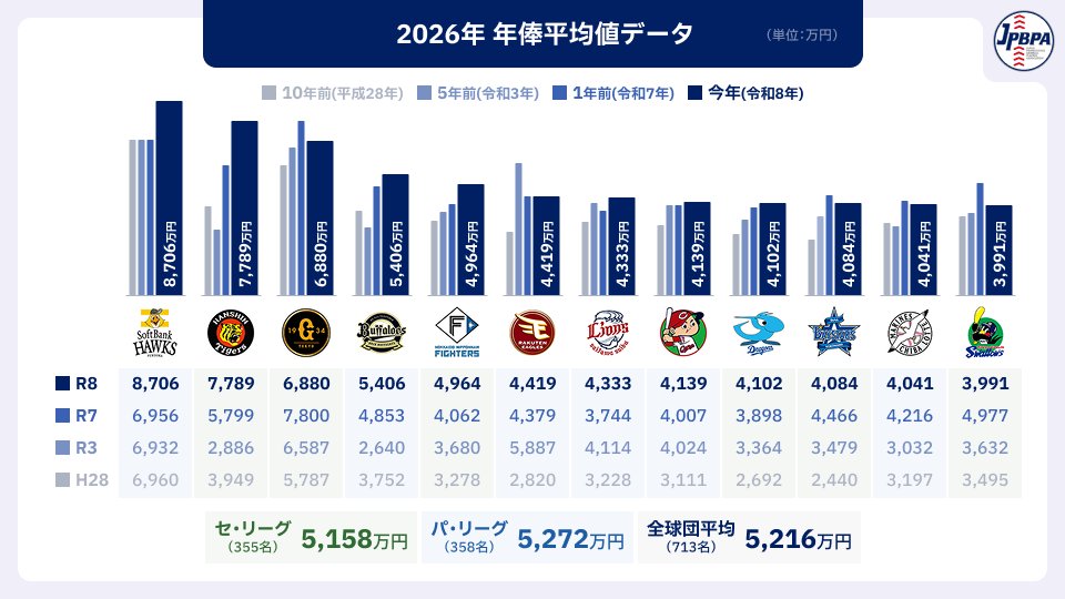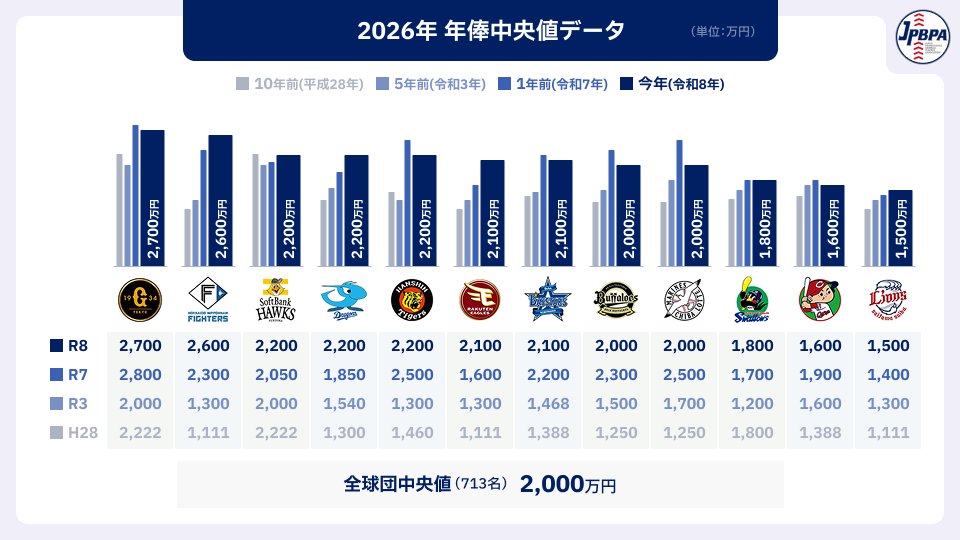 日本職業棒球選手會今天公布了以713名登錄選手為對象的2026年度薪資調查。