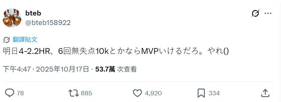 明天4-2.2HR,6局無失分10次三振的話,應該能拿MVP吧。加油