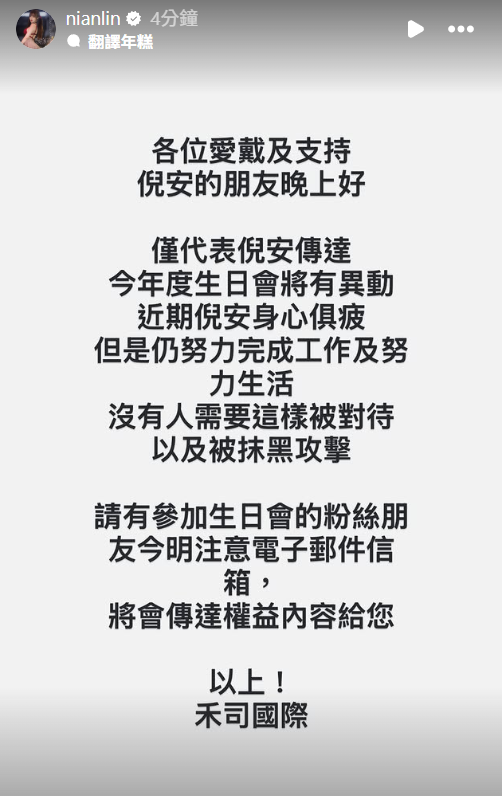 聲明中表示,林倪安近期處於身心俱疲的狀態,但仍努力完成工作及生活。除了說明生日