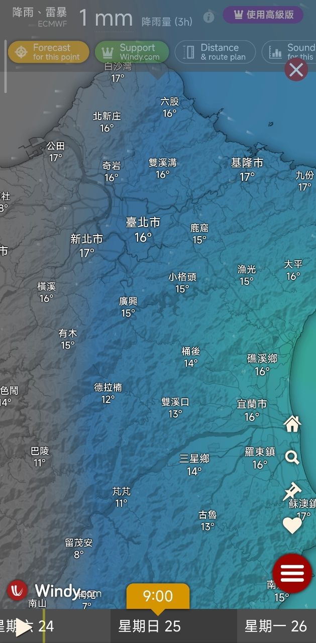 直接上圖,用3天內預測最準的氣象軟體windy去看明早台北東區的雨量預測,結果一片藍