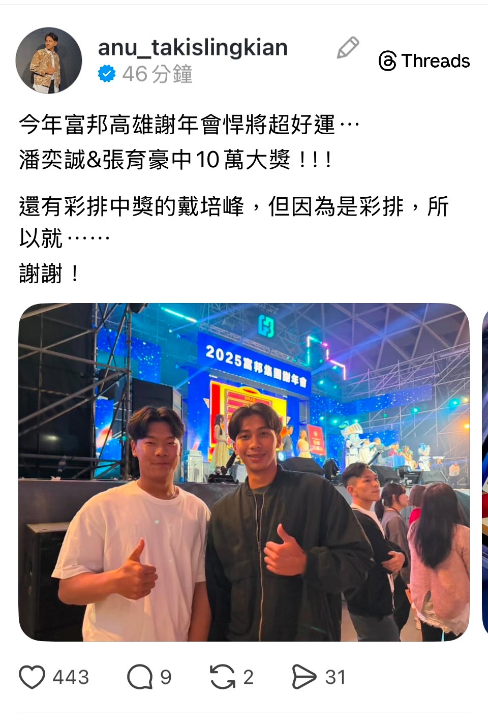 [閒聊] 張育豪 潘奕誠 尾牙抽到10萬