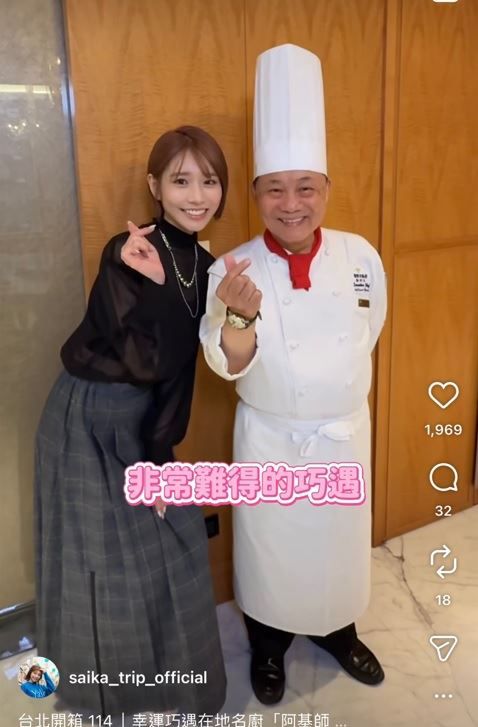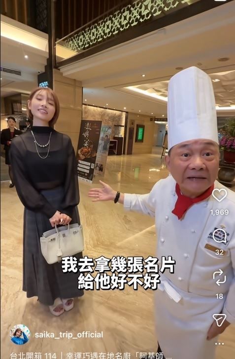 河北彩伽今在IG曬出在福容大飯店巧遇名廚阿基師的影片,並寫道,我運氣超好,在飯店