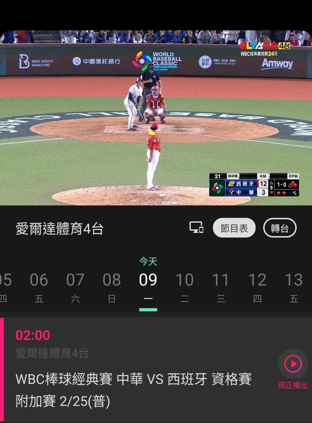 愛爾達體育四台目前正在重播WBCQ中華vs西班牙
