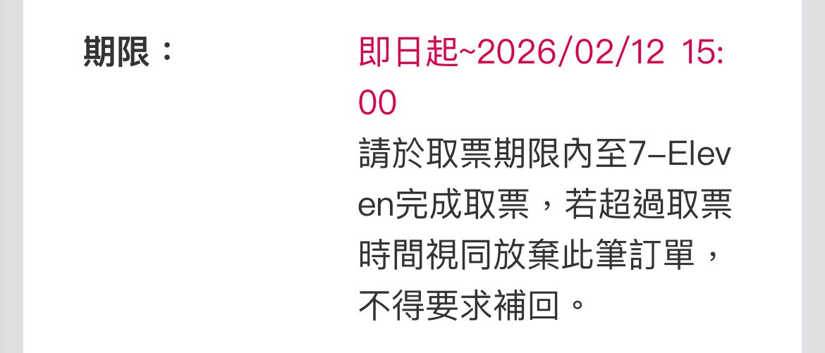 提醒一下剛剛開賣的週五上層取票時間是結完帳的三小時內哦,請趕快去取票
