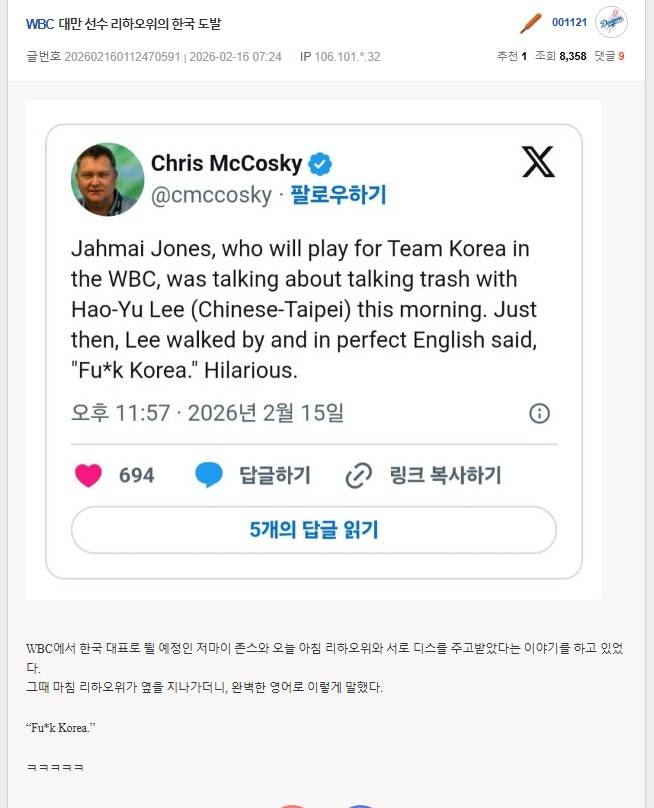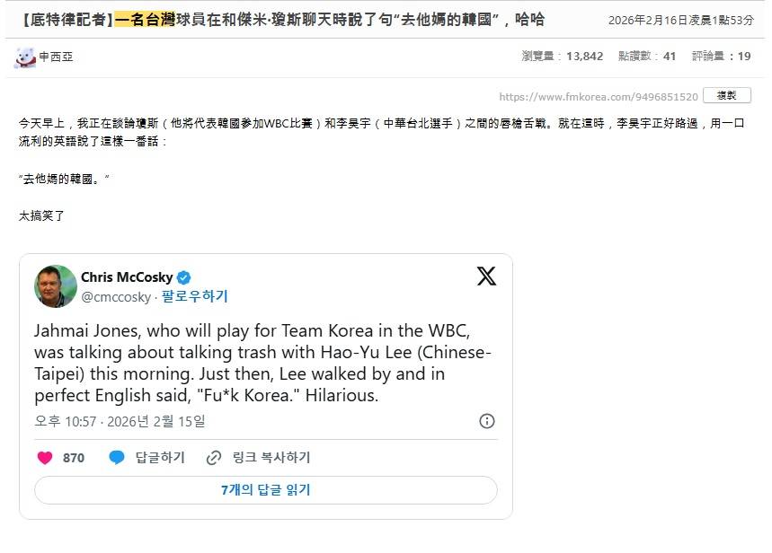 據說在聊到預計將以韓國代表身分參加 WBC 的瓊斯時,他提到今天早上和李灝宇(中華