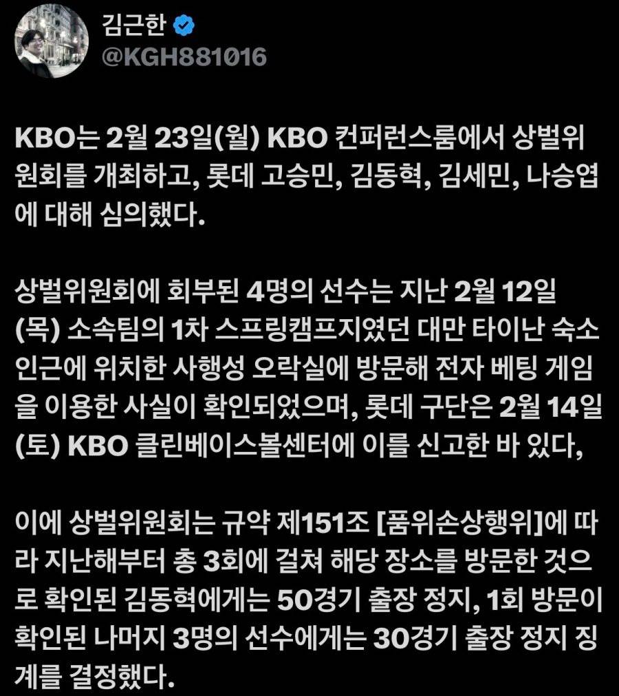 KBO於2月23日(週一)在KBO會議室召開了上罰委員會,對樂天的高承慜、金東赫、金世