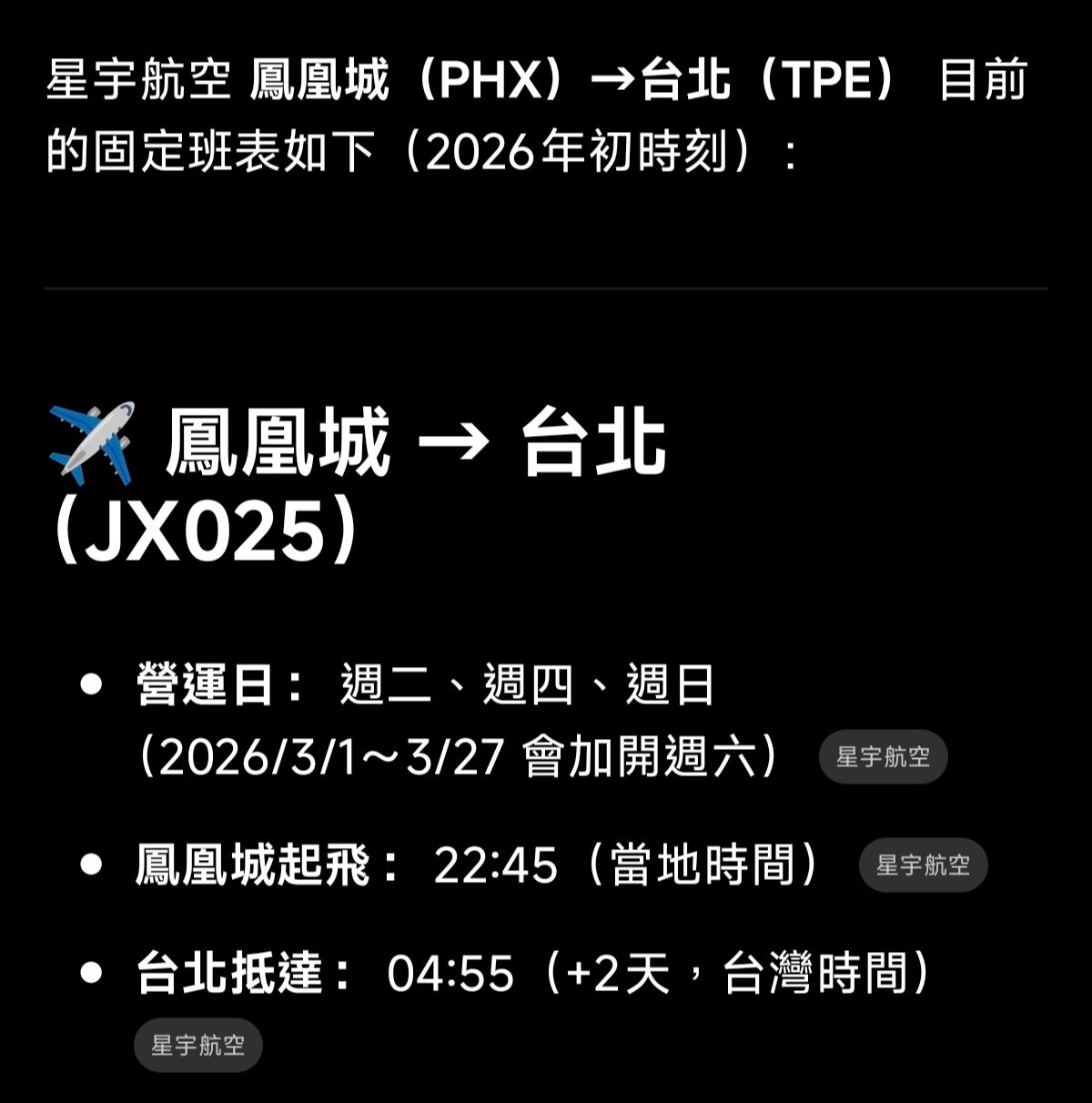 星宇,也就是台北時間稍後的13:45分起飛的星宇航空JX025。將於台北時間週四的清晨5