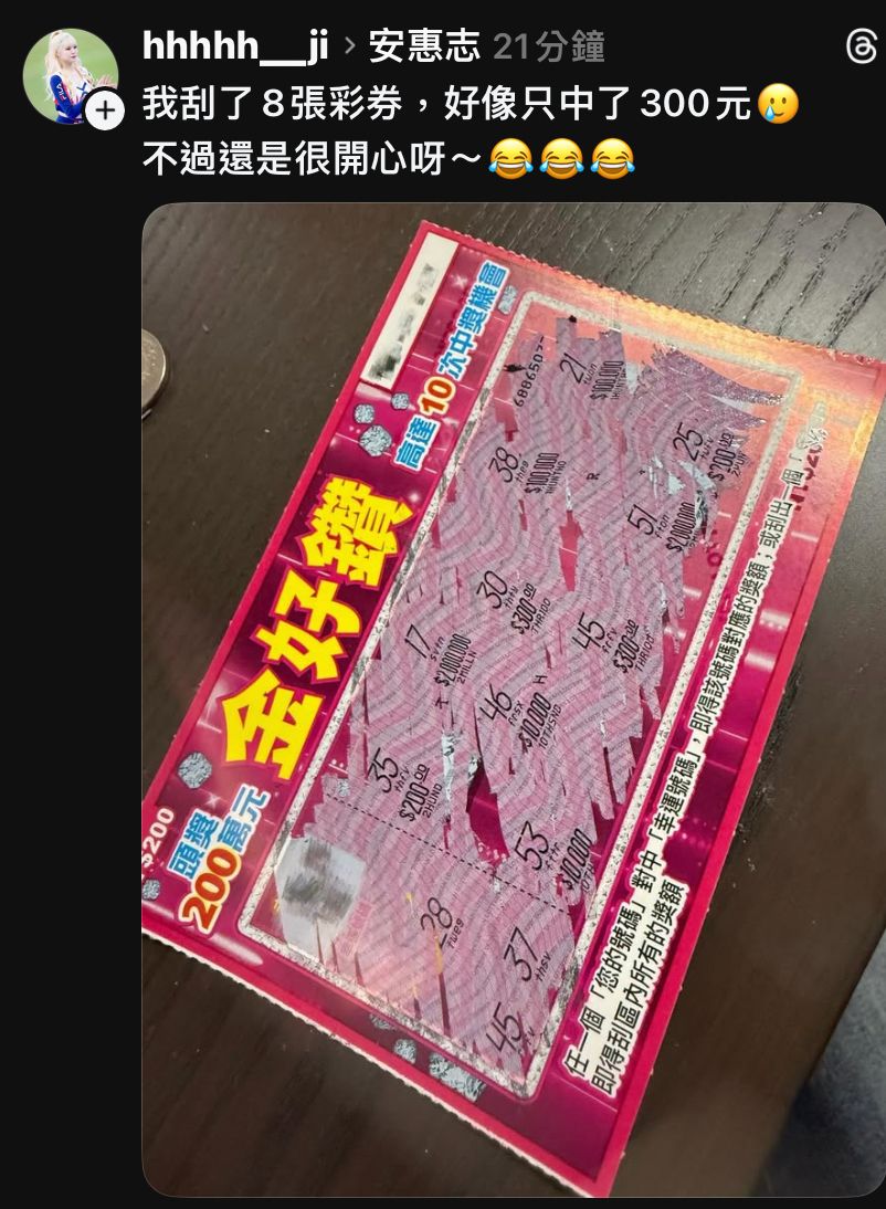 [閒聊] 安惠志:刮8張彩券只中300元