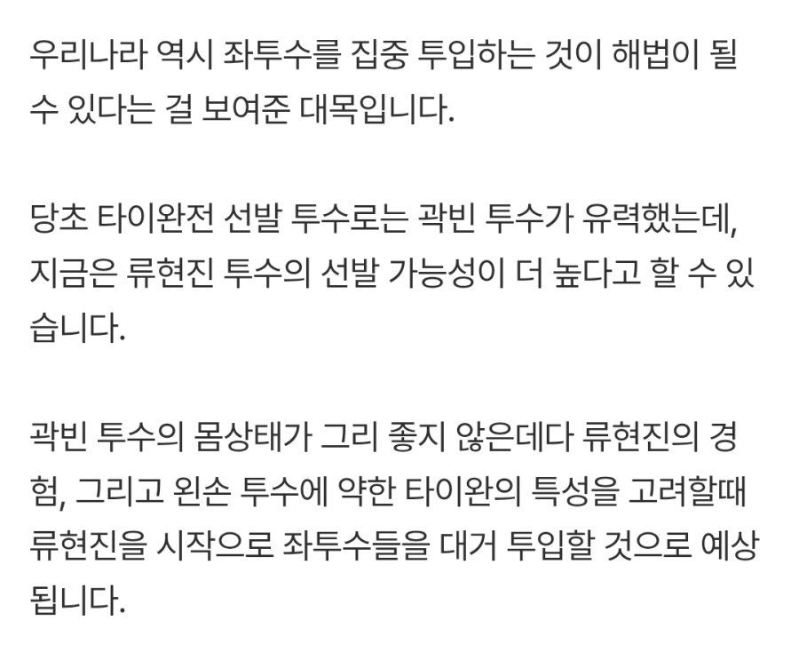 考慮到郭斌投手目前的身體狀況不是很好,再加上柳賢振的經驗,以及台灣打者對左投手