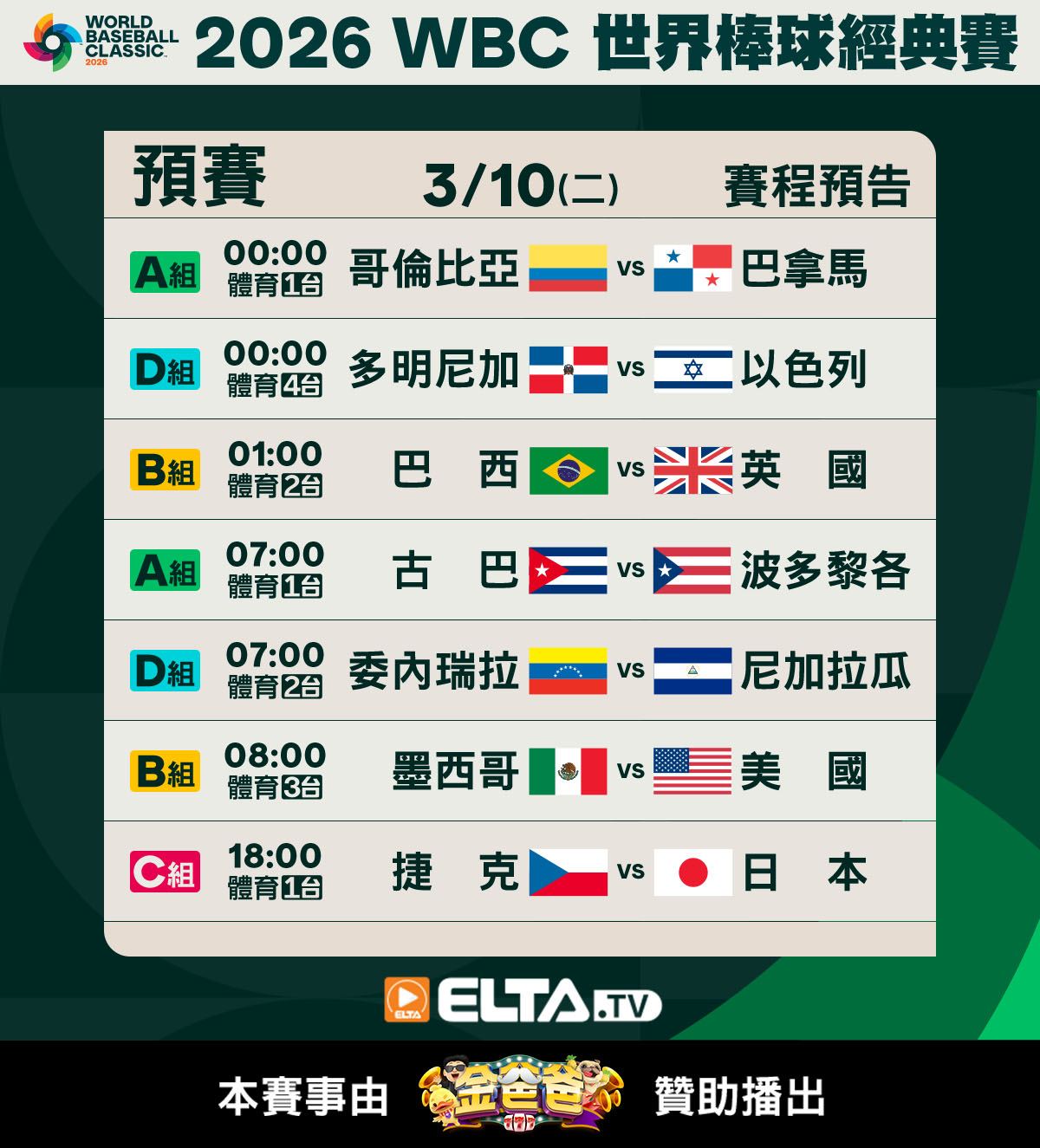 [閒聊] 3/10 WBC 愛爾達轉播班表 秉奶國一日兩戰