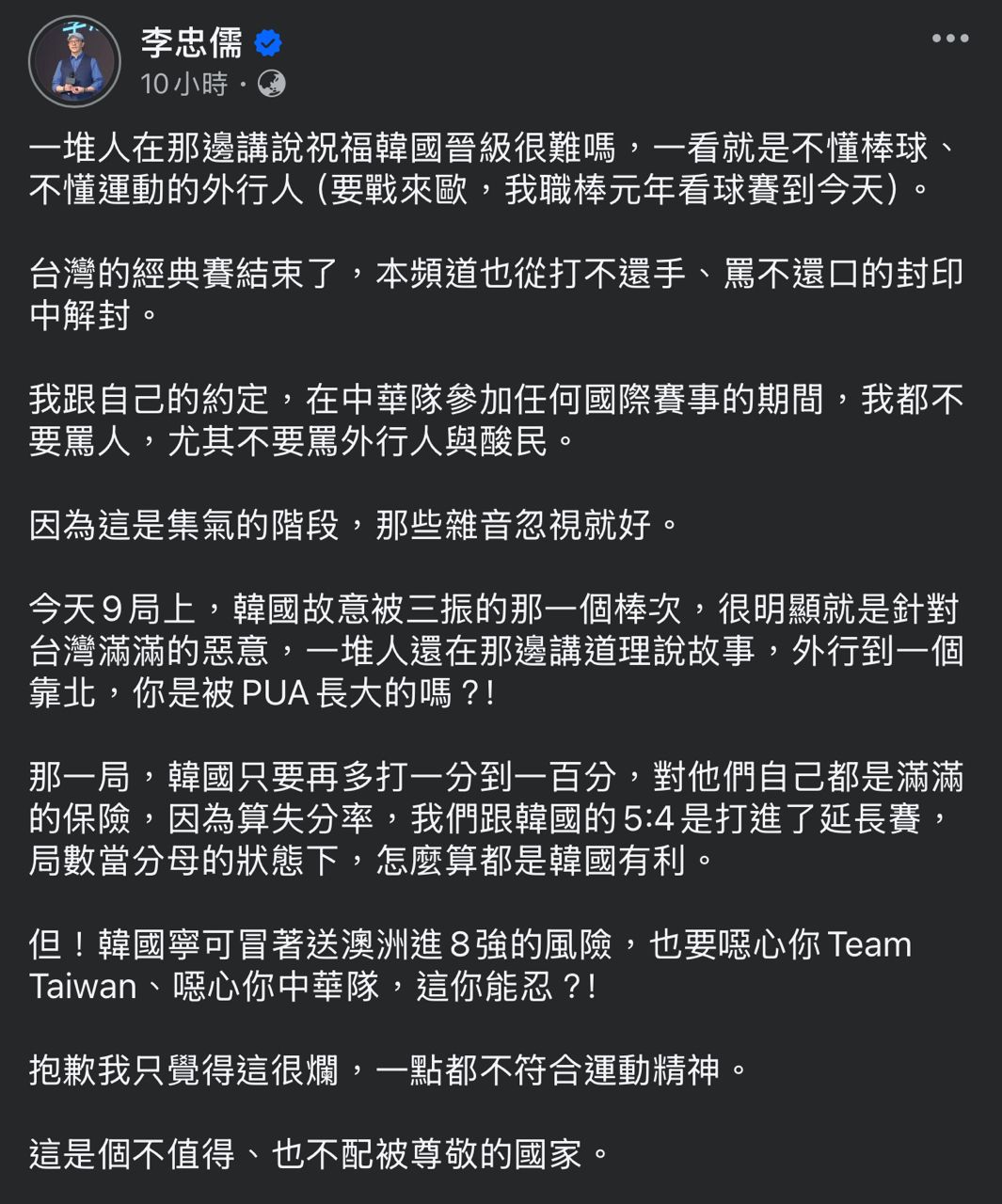 [閒聊] 戀家小舖李忠儒:韓國噁心你中華隊