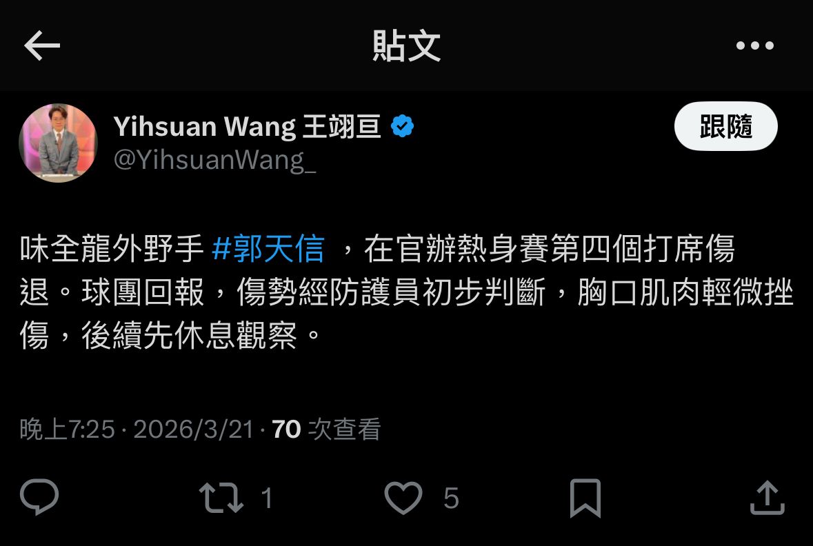 味全龍外野手 #郭天信 ,在官辦熱身賽第四個打席傷退。球團回報,傷勢經防護員初步