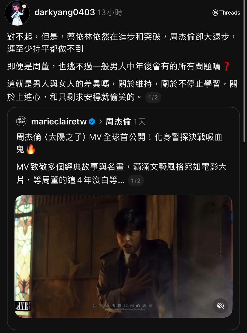 [閒聊] 台女:周杰倫是不進步中年男人 反觀女人