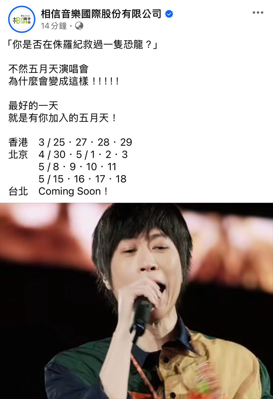 剛剛相信音樂的貼文 間接證實五月天將回台北