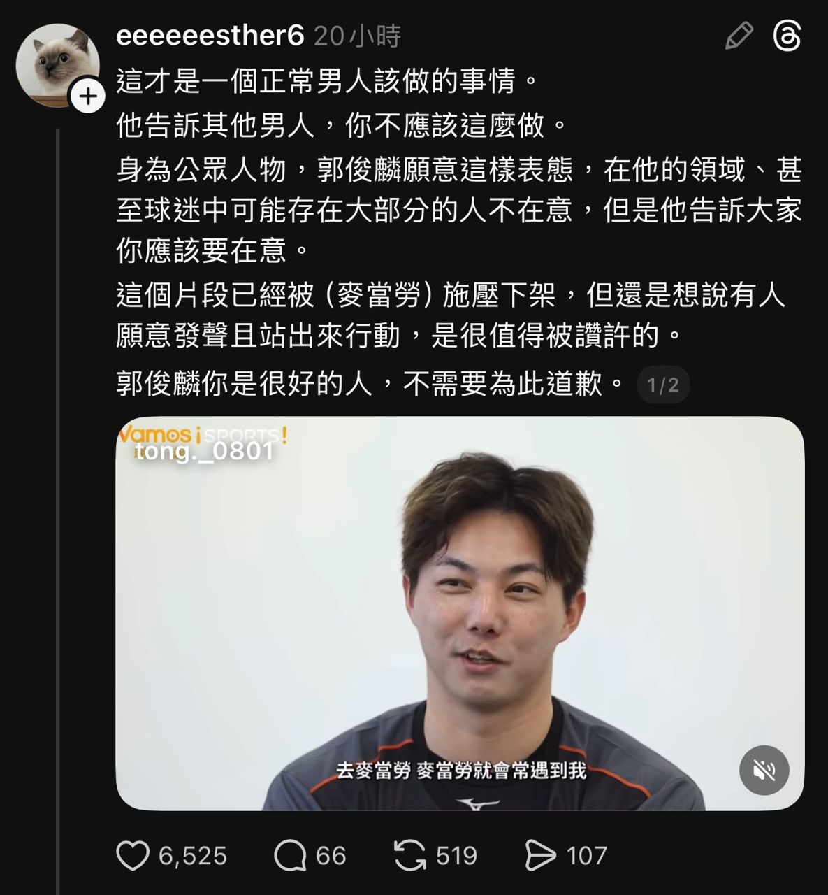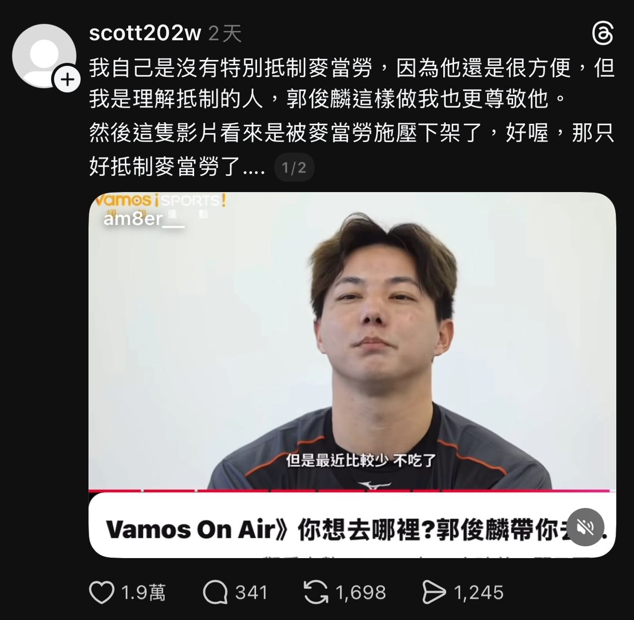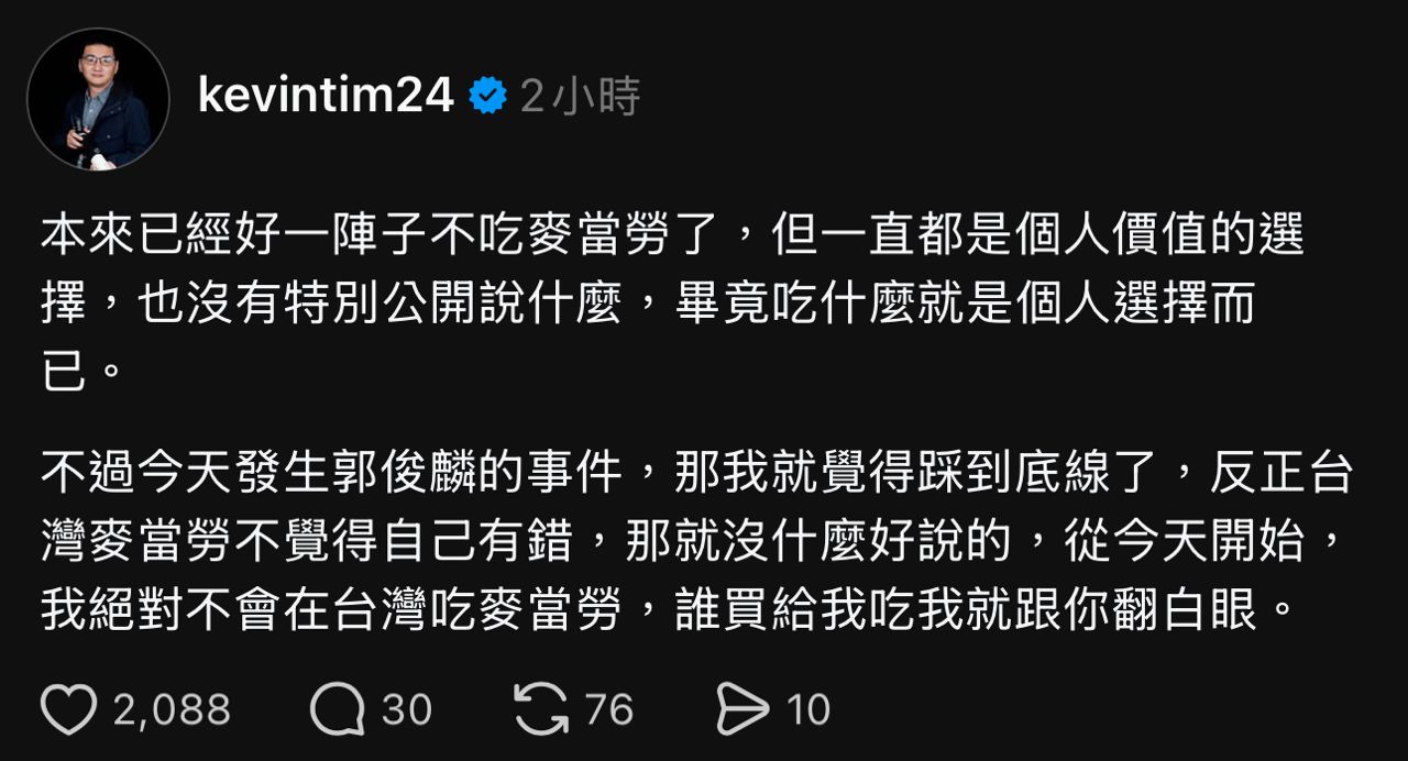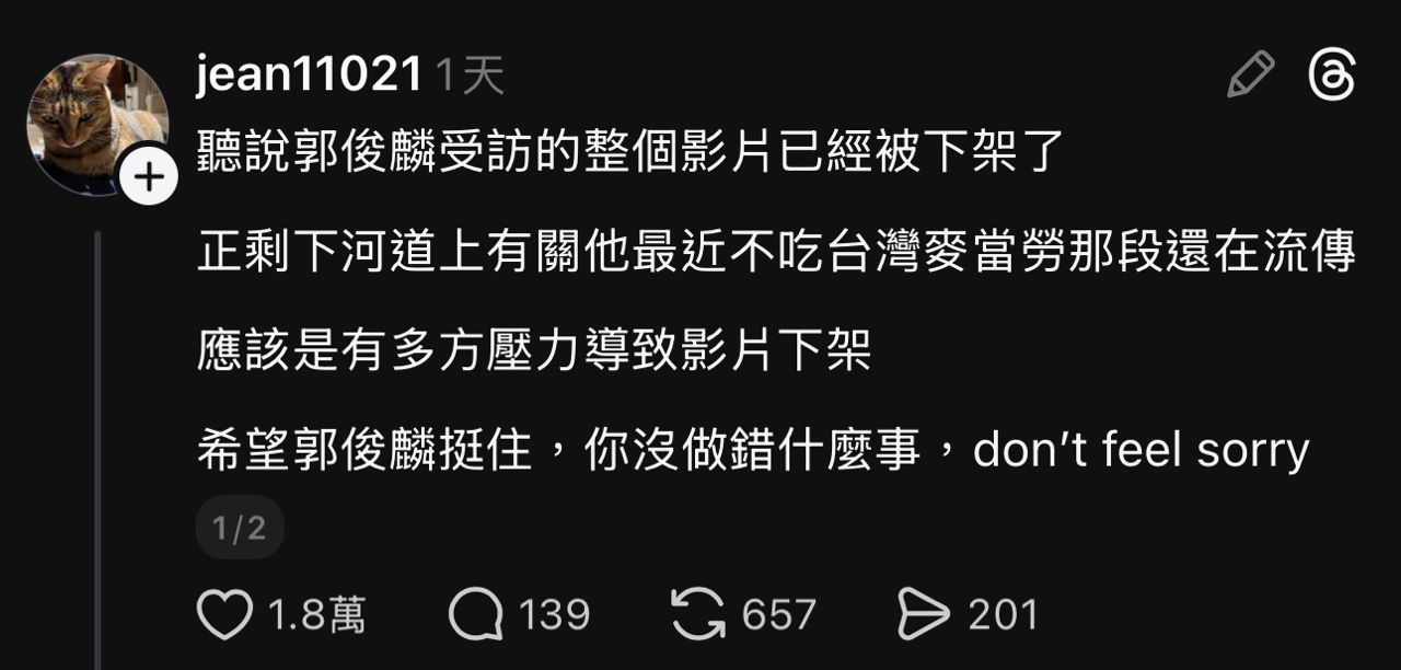[閒聊] 郭俊麟高呼沒吃麥當勞的影片被下架?