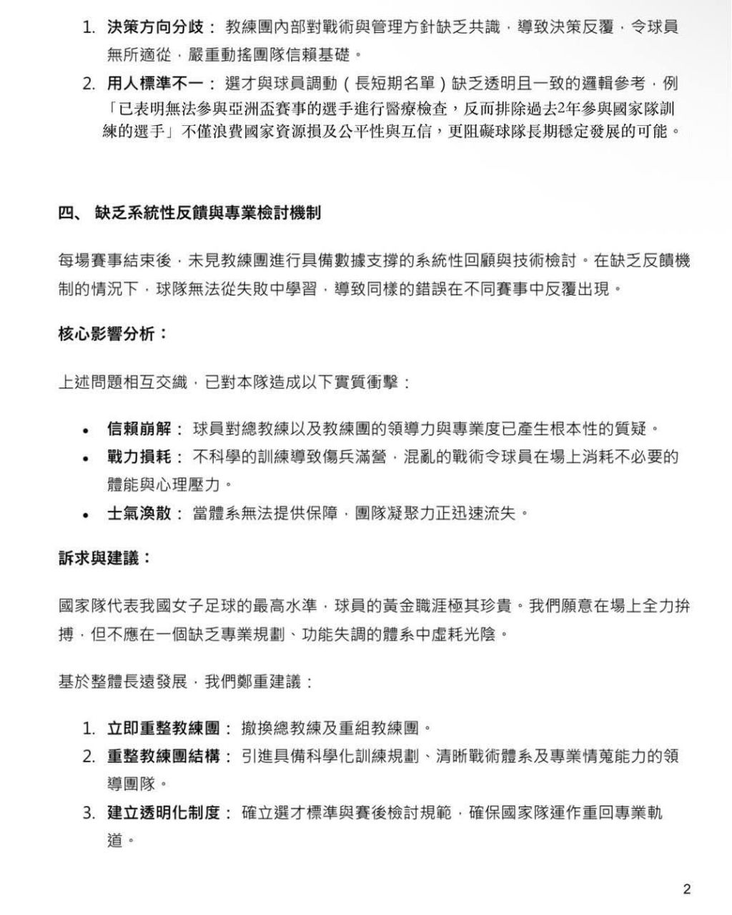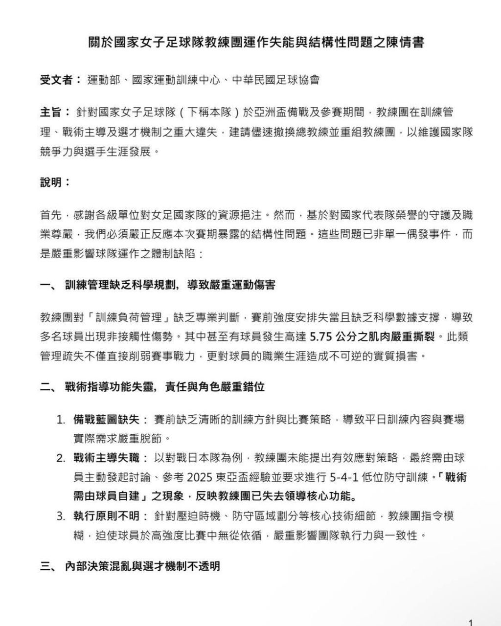 [關於國家女子足球隊教練團運作失能與結構性問題之陳情書]