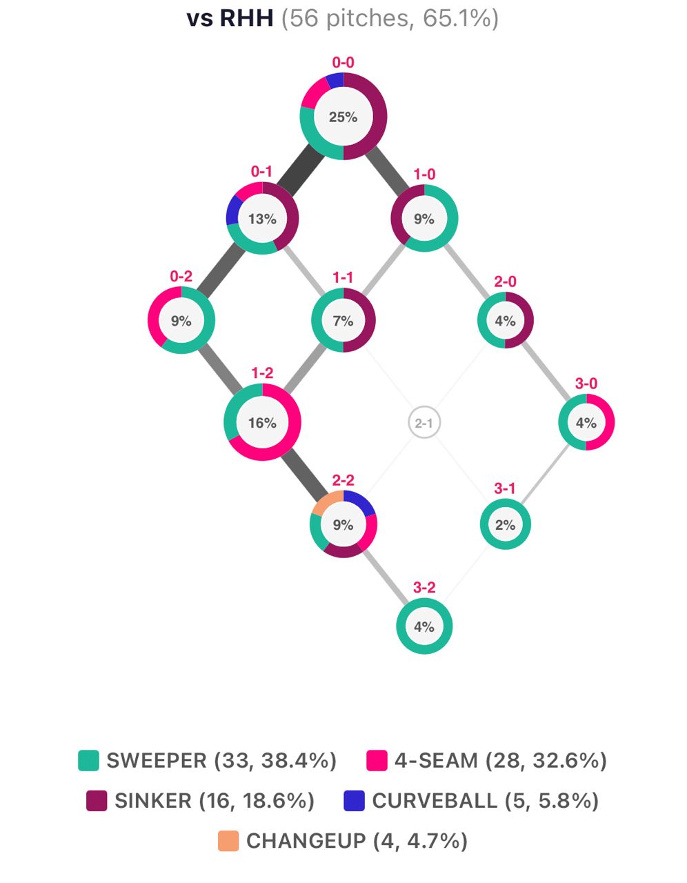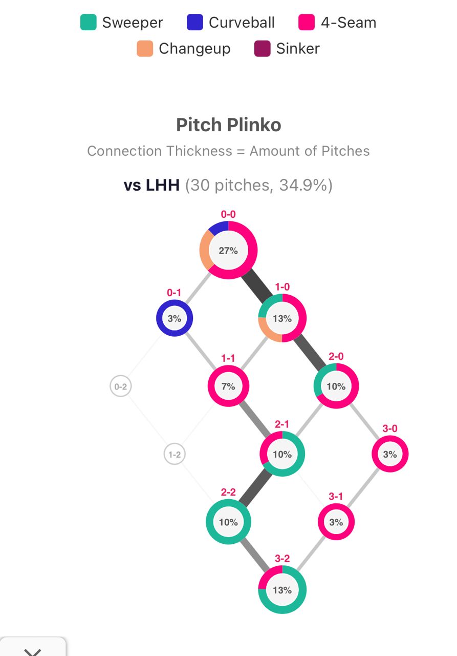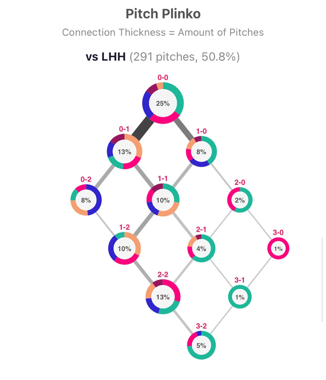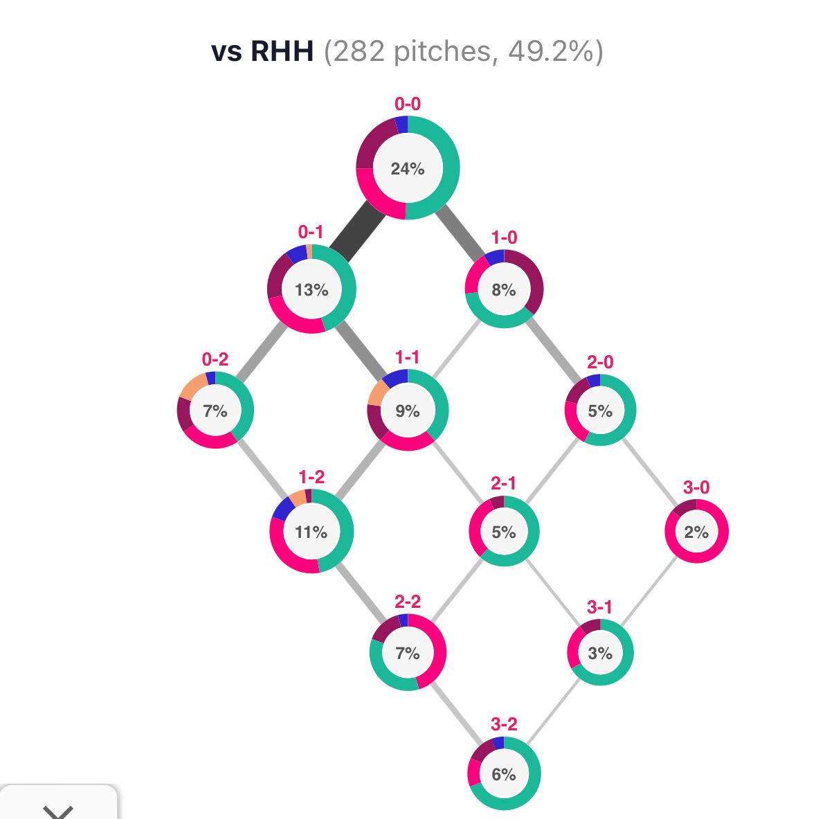 4. 四縫表現比去年還差,到現在揮空率0%,被打進場內HARD-HIT%是100%,連今天好球帶外四縫被打又是超過95MPH的強勁擊球,繼續100% HARD-HIT比例。