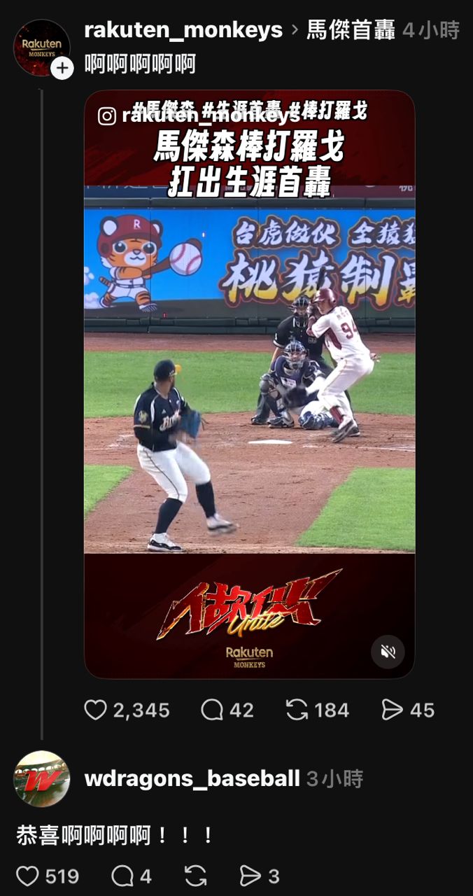 [閒聊] 味全龍官方在馬傑森首轟影片下恭喜