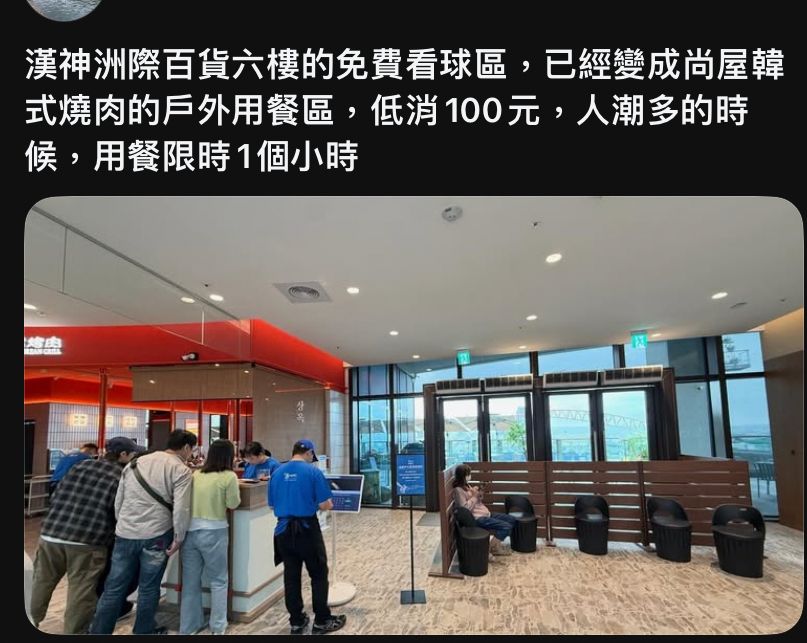 [閒聊] 漢神免費看球區變燒肉用餐區 低消100