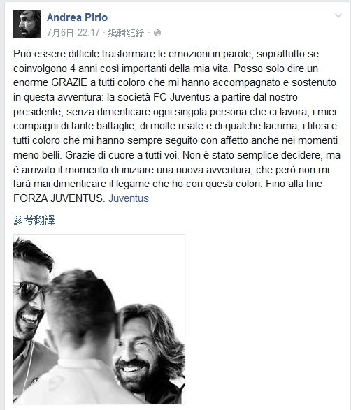 皮爾洛離尤文發動人感言:永不忘卻黑白色的烙印