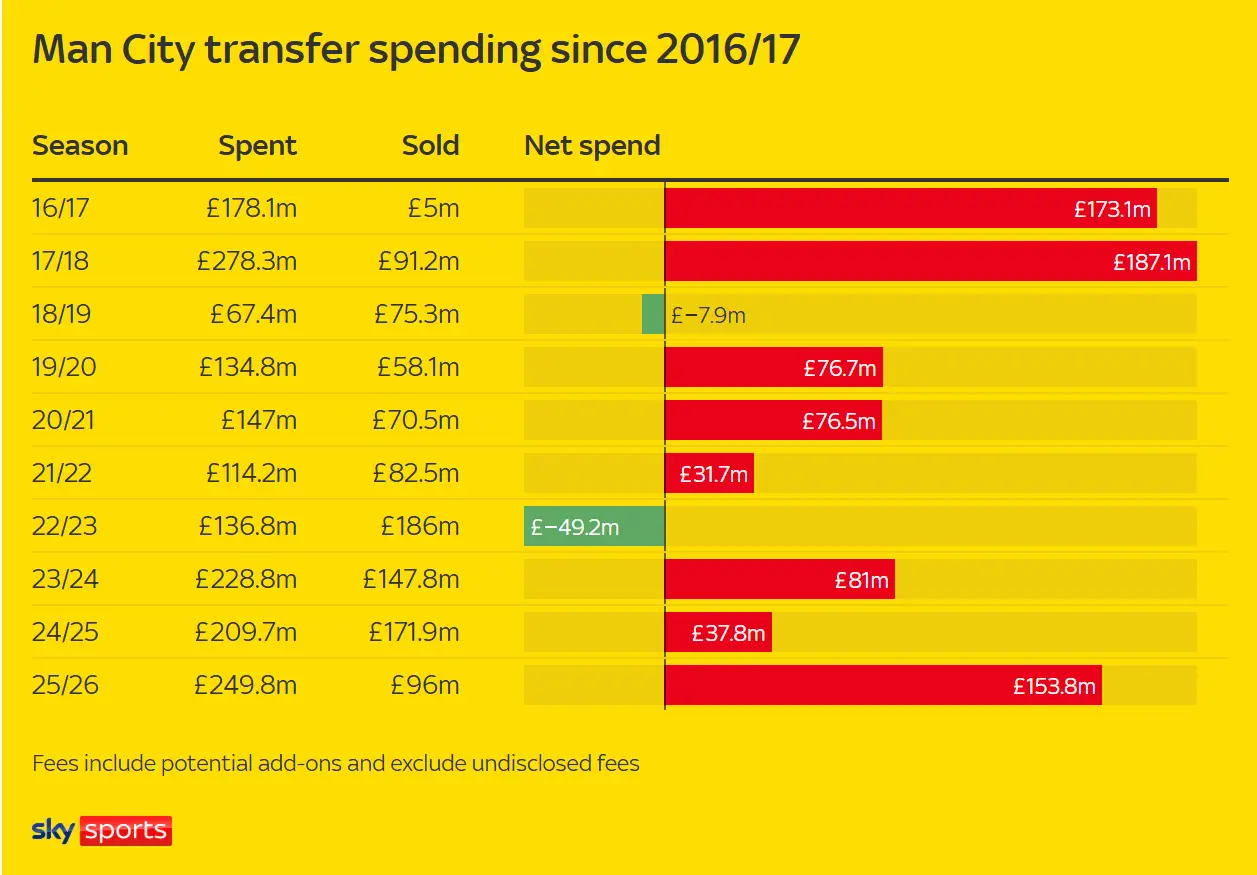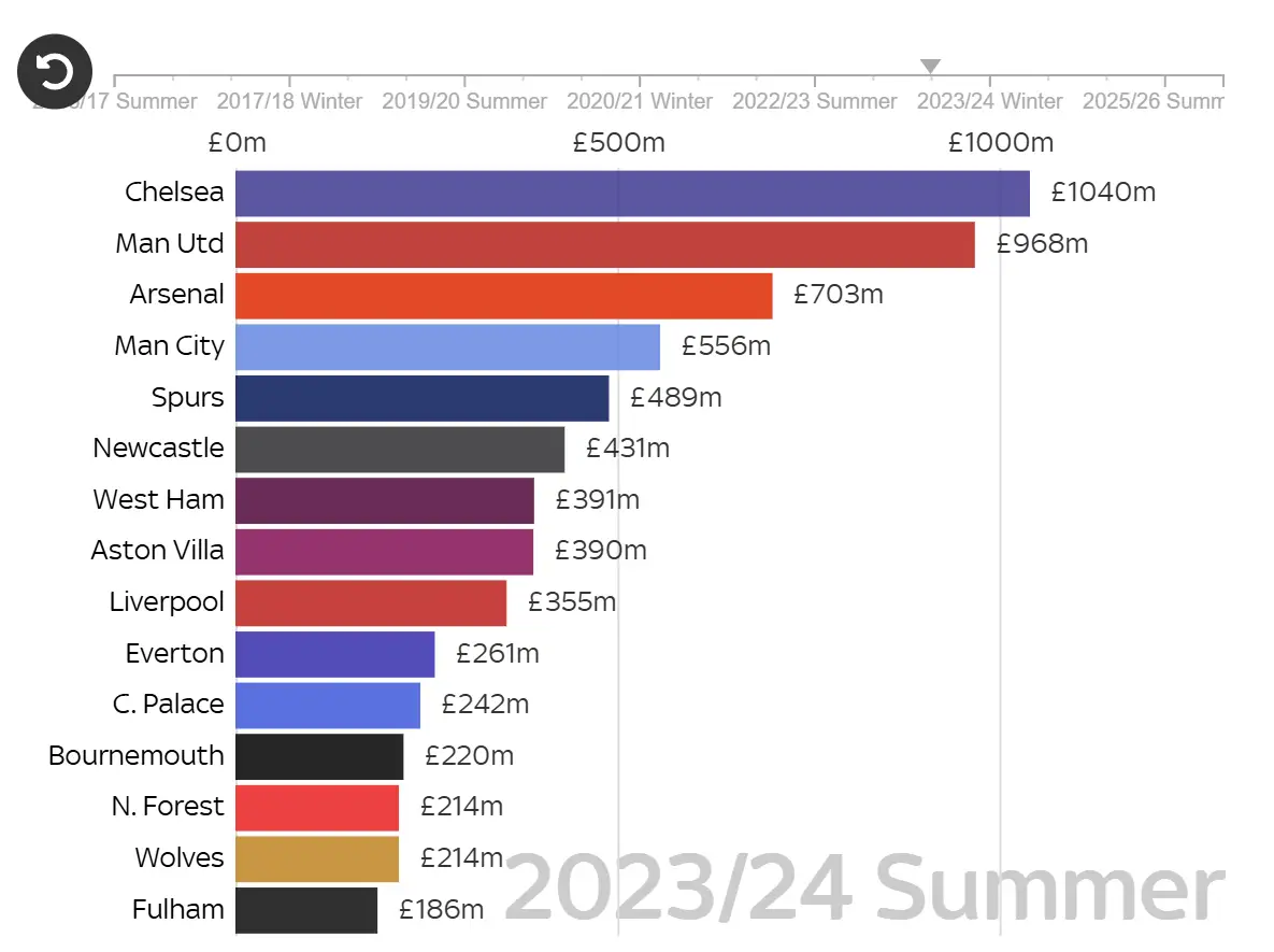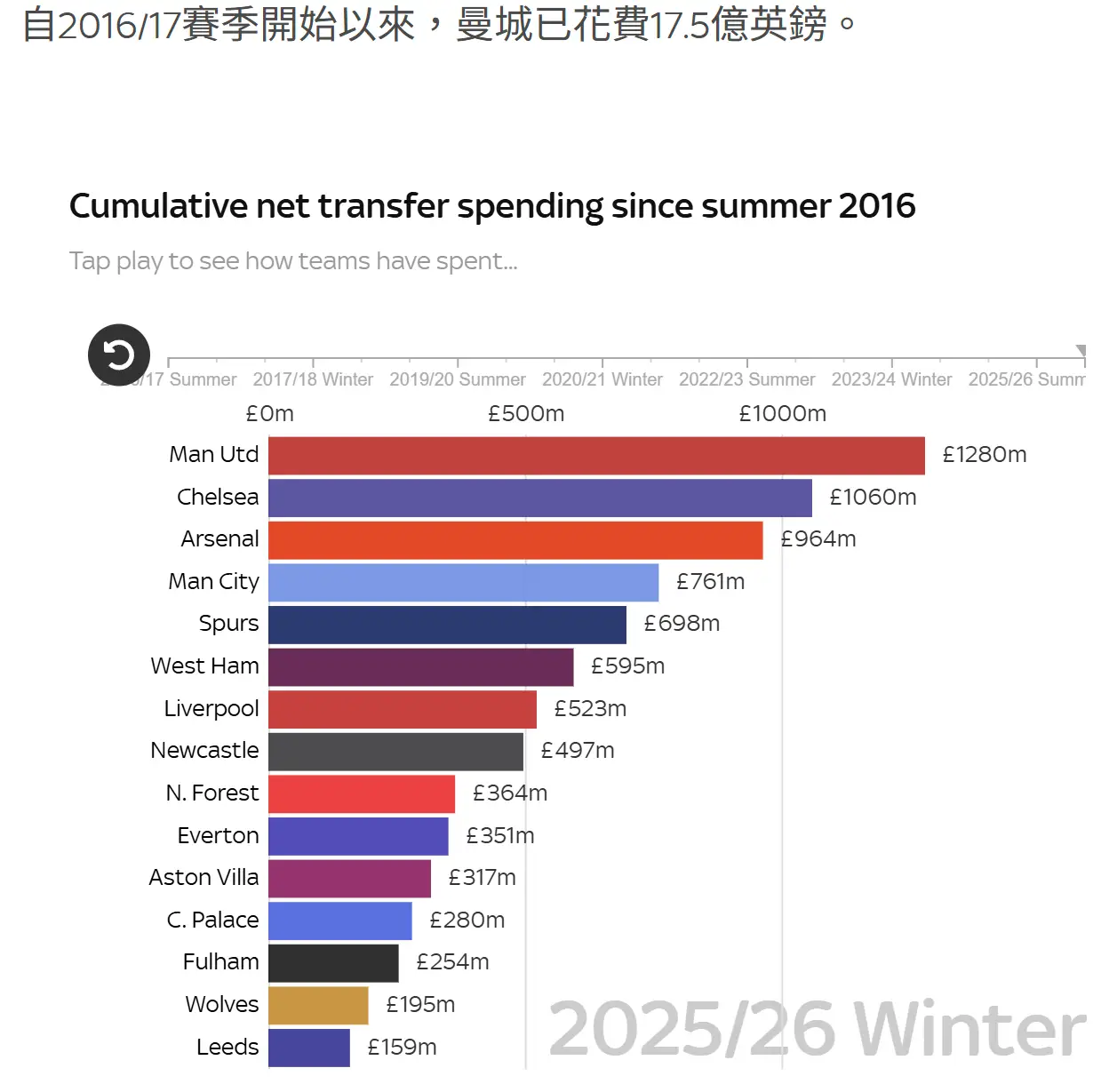 [閒聊] 英超各隊自2016年夏季以來累計淨轉會支出