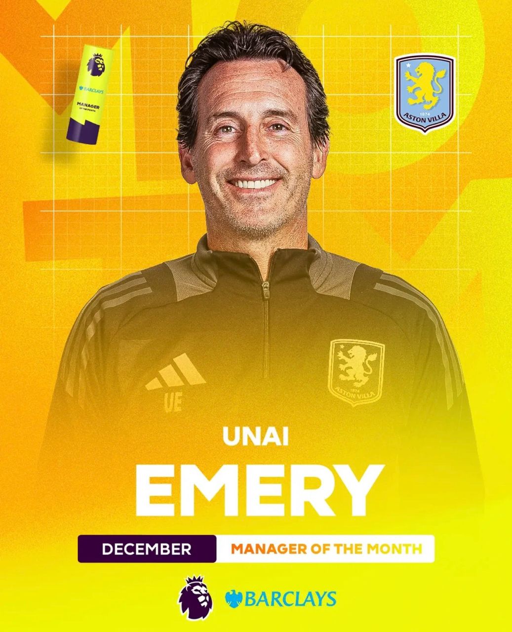 豪取聯賽八連勝的阿斯頓維拉主教練 UNAI EMERY勝出(連勝記錄於年底遭槍手終結)