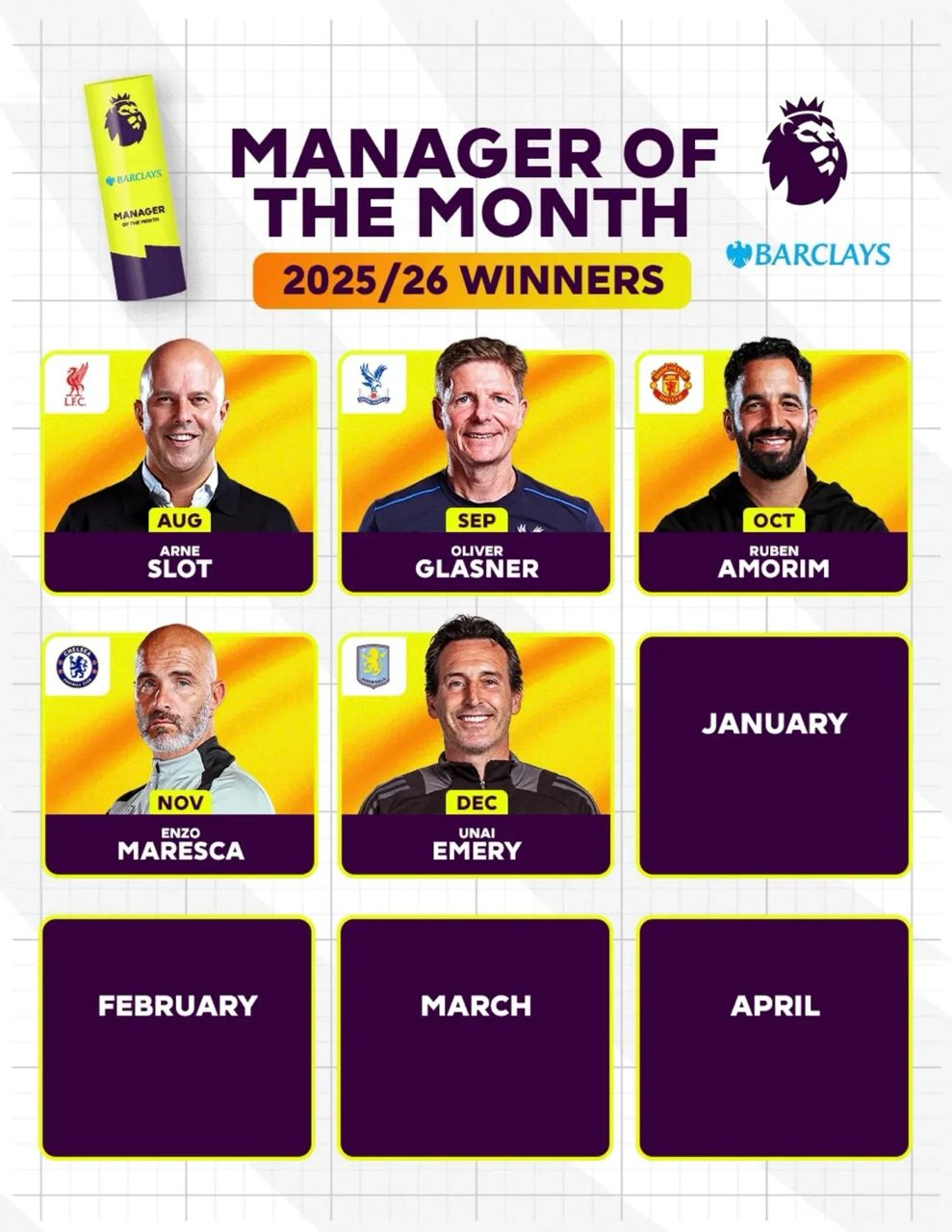 隨後英超官方也放上本賽季至12月分的最佳教練名單