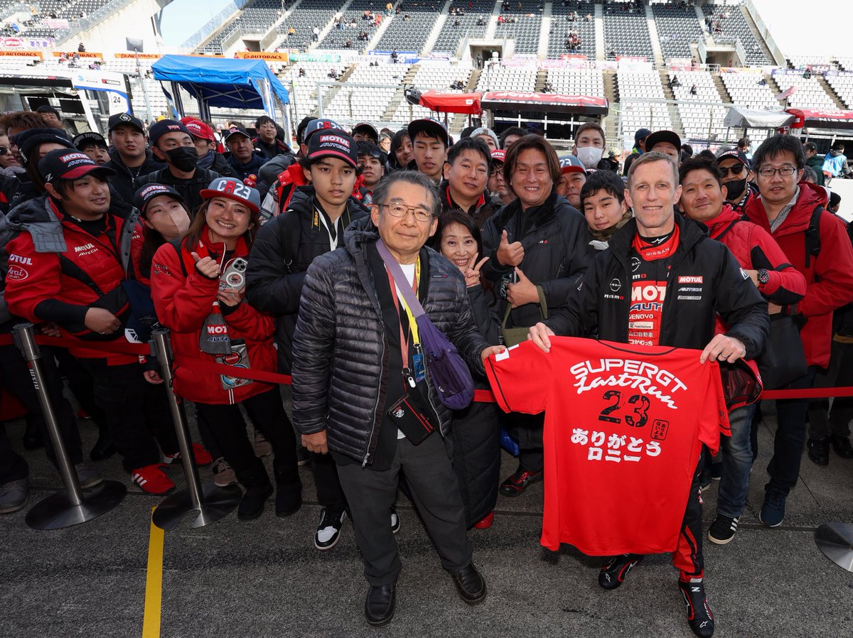 TOM'S 今天的車手介紹有拿車迷的簽名紙致謝 (旁邊有山本畫上第二隻眼睛的不倒翁)