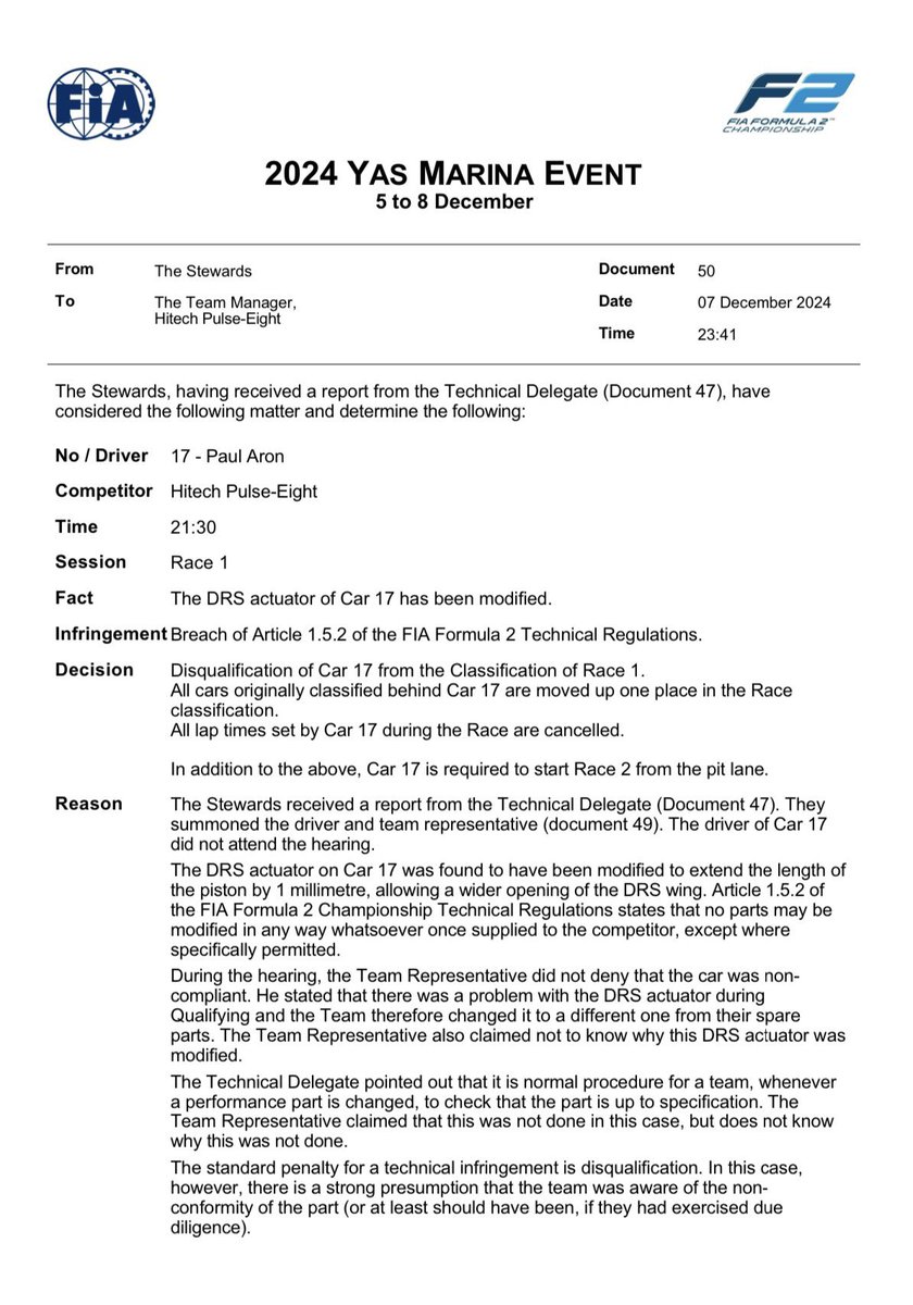 所以被罰 Paul Aron 排位賽成績取消, Sprint Race 取消資格