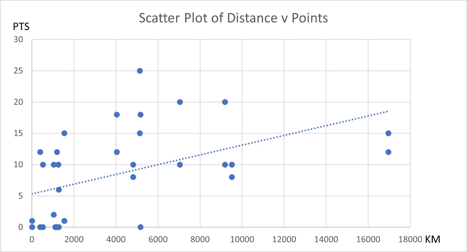 可以發現雞米的離家距離與得分間具備顯著的高度正相關