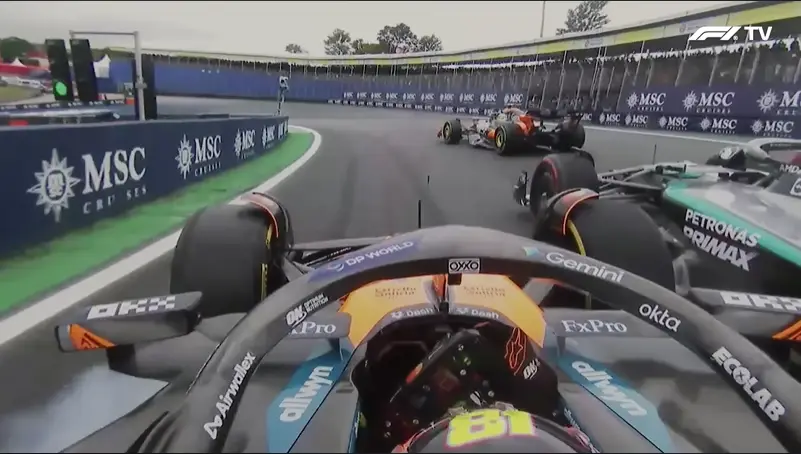 : 觀眾角度拍的,Lando放道具,壓到的有四台車,只有max救回來