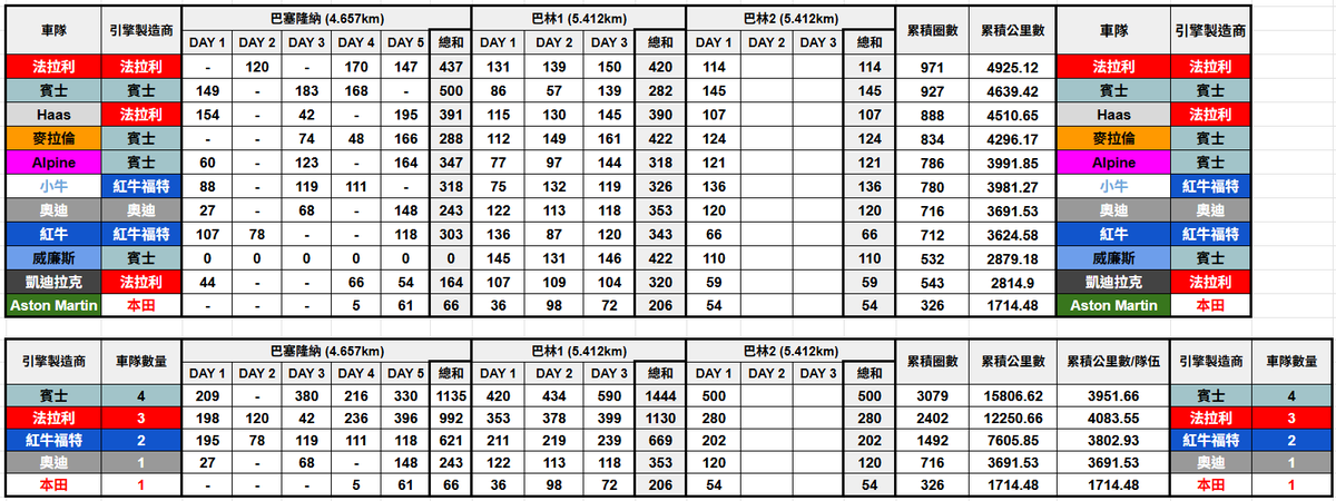 1.前兩次測試車隊/引擎製造商累積圈數/公里數一覽: