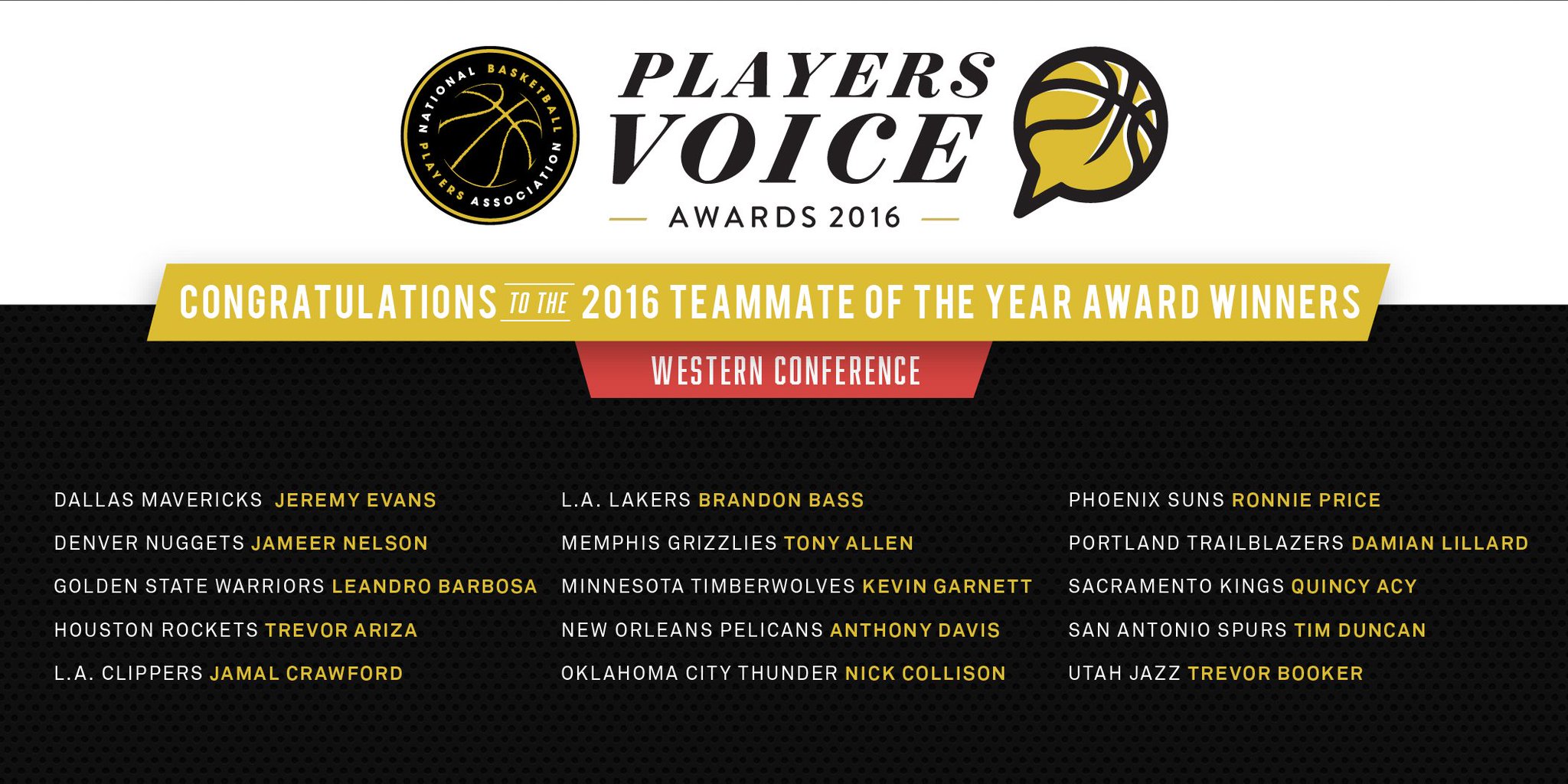 最佳隊友 (西部):傑裡米-埃文斯(小牛)、布蘭登-巴斯(湖人)、羅尼-普萊斯(太陽)、賈米爾-尼爾森(金塊)、托尼-阿倫(灰熊)、達米安-利拉德(拓荒者)、萊昂德羅-巴博薩(勇士)、凱文-加內特(灰狼)、昆西-埃西(國王)、特雷沃-阿里扎(火箭)、安東尼-戴維斯(鵜鶘)、蒂姆-鄧肯(馬刺)、賈馬爾-克勞福德(快艇)、尼克-科裡森(雷霆)、特雷沃-布克(爵士)。