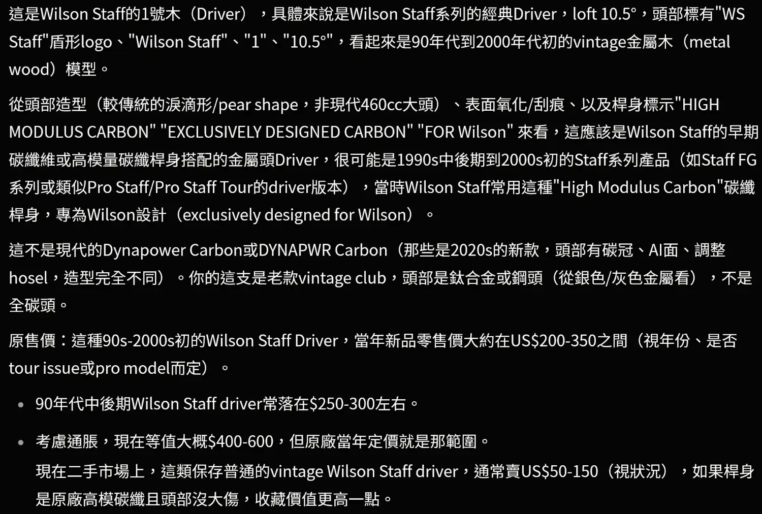 同時問ChatGPT和Grok都說這隻叫做「Wilson Staff 1號木桿 Driver 10.5° 碳纖維桿身」