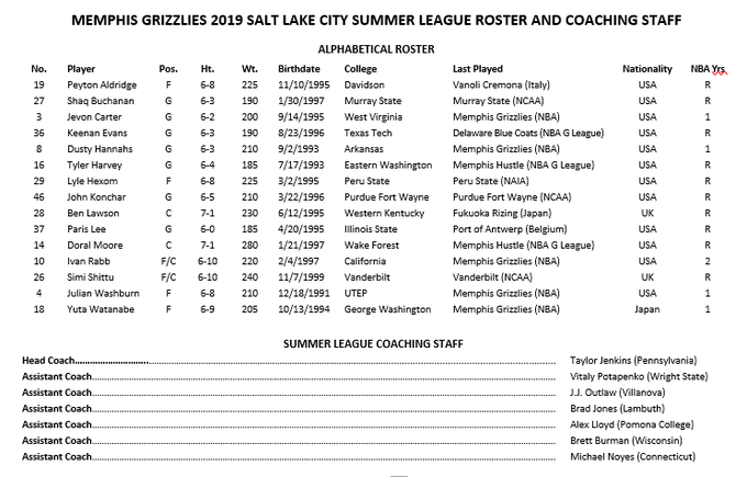 2019 Salt Lake City Summer League Roster: