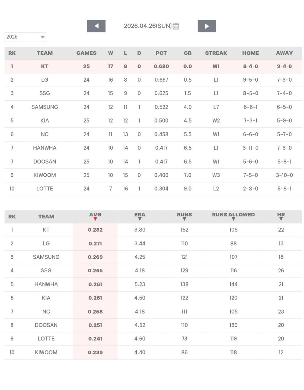☆2026戰績(~4/26)(來源:KBO官網)