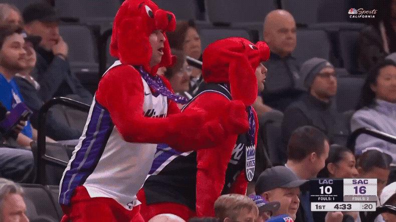 Nique上場後,場邊就有球迷穿著Clifford大紅狗套裝來幫Nique加油