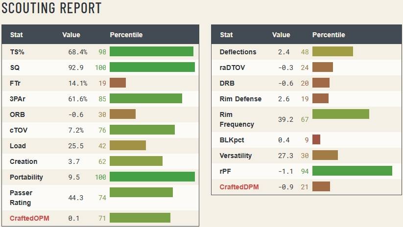 分之百的球員,但CraftedDPM防守影響力評分為-0.9,僅超過全聯盟21%的球員,屬於很差