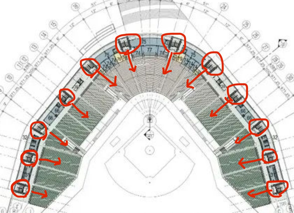 座位橫向動線不足,尤其在內野區,中段幾乎沒有可通行的走道,必須繞到最上層或最下