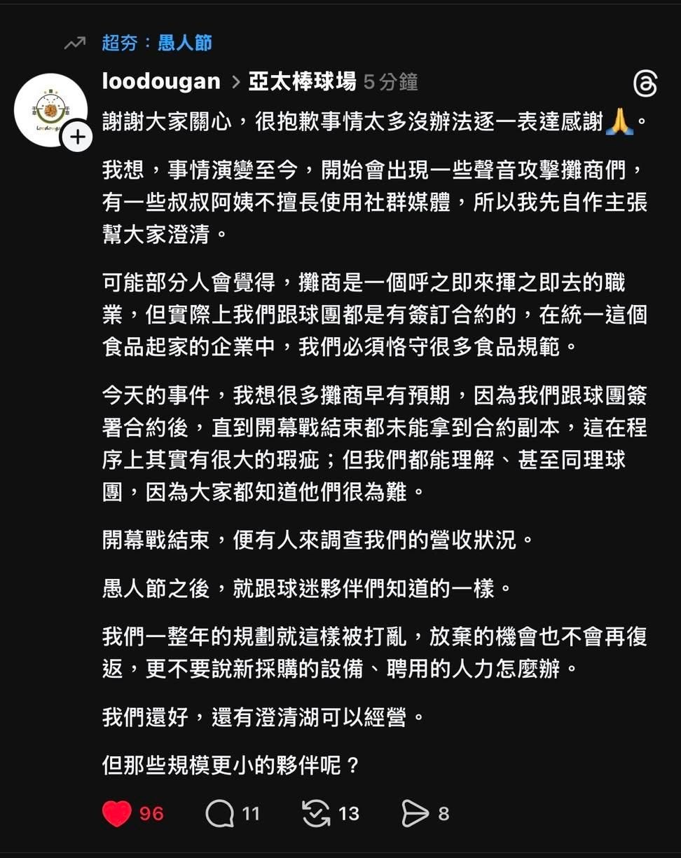 統一 7-ELEVEn 獅隊再次感謝所有戶外美食店家的辛勞與付出,也感謝球迷長期以來的支持與理解。球團將持續努力,守護屬於大家的棒球時光