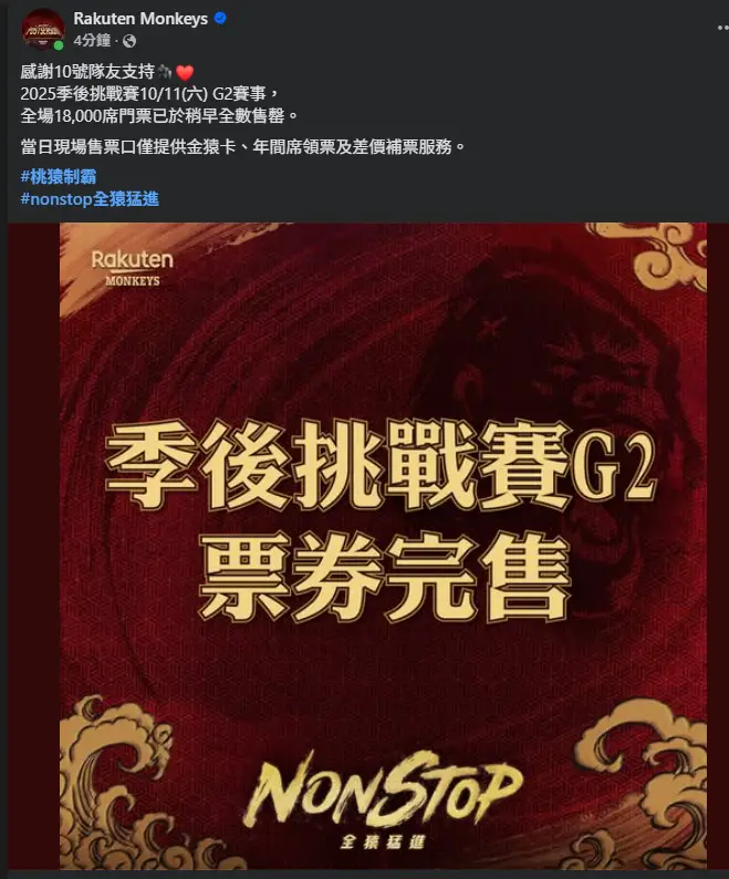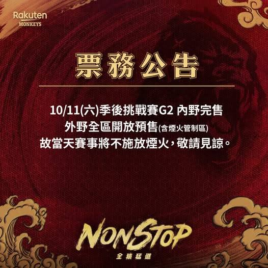 10/11(六)季後挑戰賽G2 內野完售,外野全區開放預售(含煙火管制區),故當天賽事將不