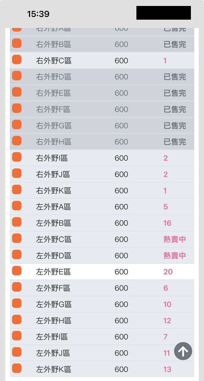 右外野差不多售完,偶爾出現零星空位。