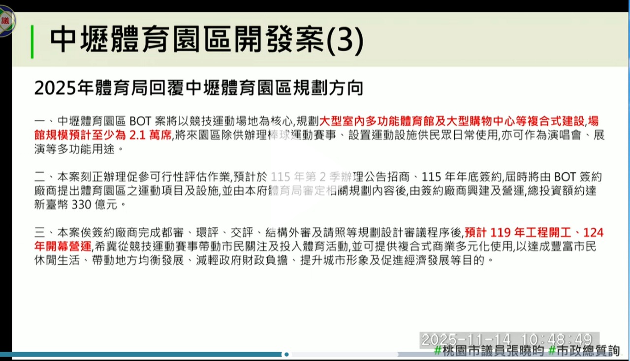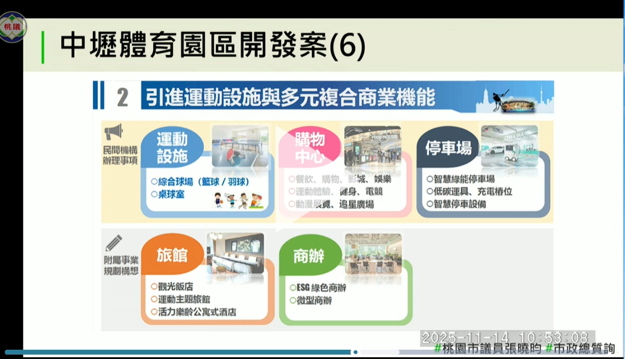 張曉昀在議會總質詢時表示,中壢體育園區計畫緣起是滿足民眾運動需求,一併緩解交通